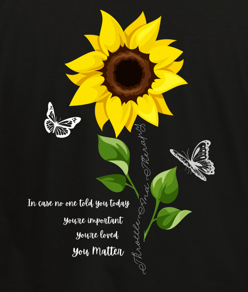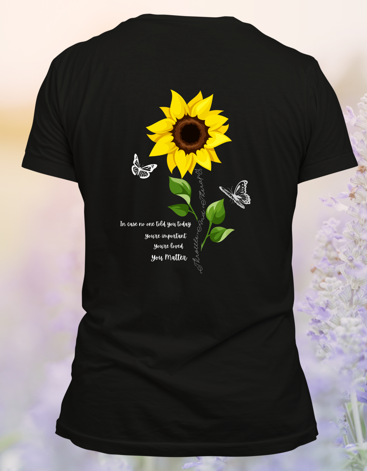 Celebrate your worth every day with this inspiring shirt. Featuring the heartfelt message, "In case no one told you today, you're important, you're loved, you matter," alongside delicate butterflies and a bright sunflower, it’s a beautiful reminder for women to embrace their value and strength. Wear it to uplift yourself and those around you, spreading positivity and confidence wherever you go. This shirt is more than clothing—it’s a daily affirmation that you are truly worth it.